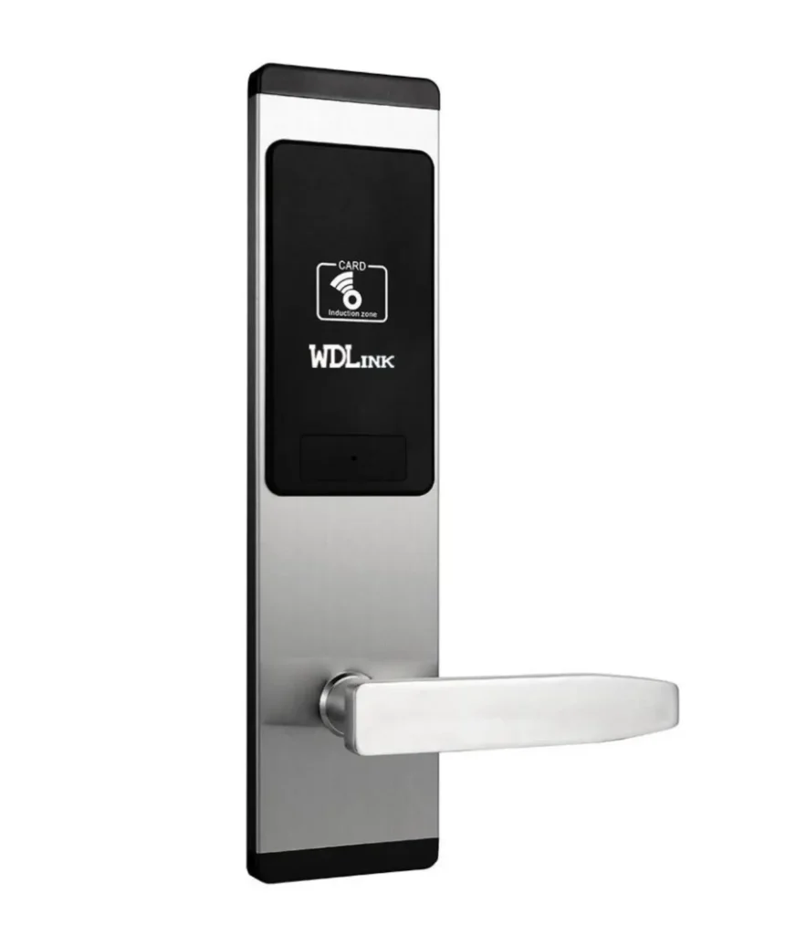 WDS1000S is a modern style hotel door lock with integrated Mifare reader. The case is made of stainless steel with gold and silver colors. The lock supports work with Mifare-1 13.56 MHz cards.
